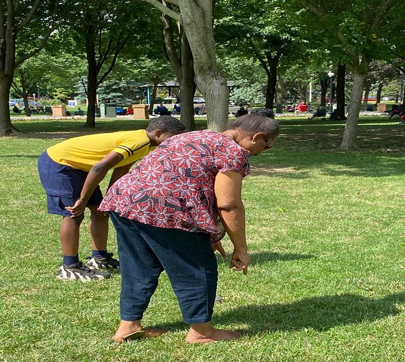 A senior and a teenager get on their marks to run a race in their local park on a beautiful day. Apart from their age difference, they are equipped differently. The teenager has running shoes on while the older adult chooses to run bare foot.